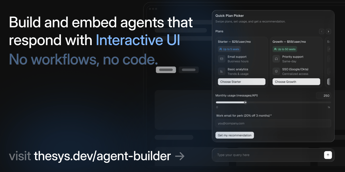 With Thesys Agent Builder, visitors can ask questions and get interactive answers—charts, tables, and insights—right inside your site.